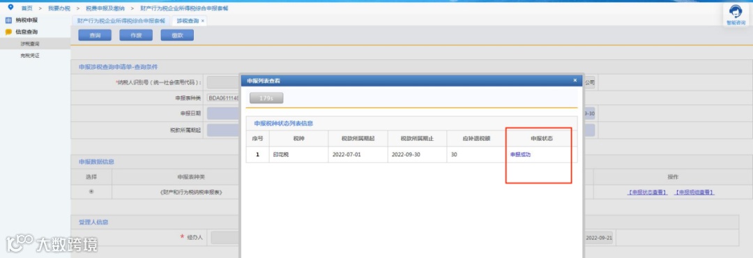 点击“查询”按钮后,显示已申报报表信息,点击“申报状态查看”,可以查看申报状态。