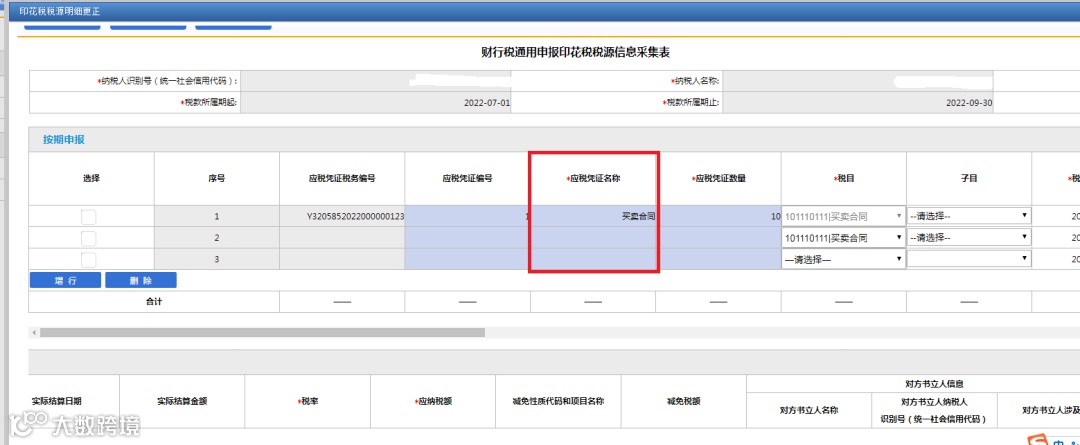 存在按期申报印花税税(费)种认定的纳税人,系统会自动分别带出1条税(费)种认定对应的税源信息,纳税人可通过增行按钮新增税源信息,按次申报的税源信息可以自由添加。