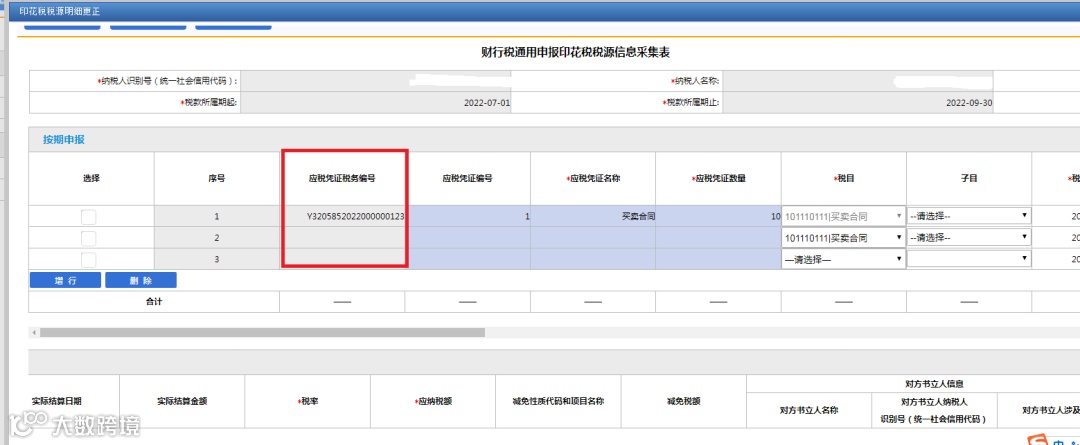 【应税凭证税务编号】:不需进行填写。当填写《印花税税源明细表》全部必填项目后,系统自动生成。如图所示。