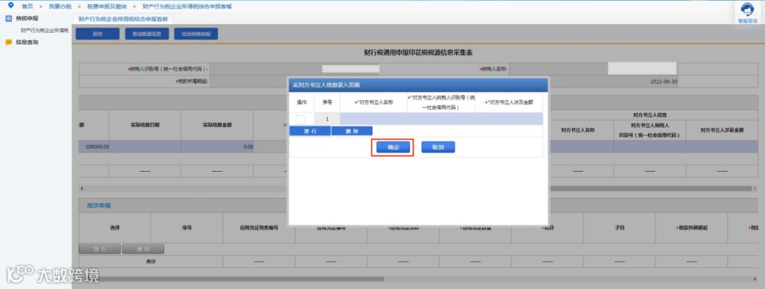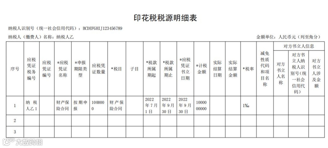 纳税人乙按季申报缴纳印花税,2022年第三季度书立财产保险合同100万份,合同所列保险费(不包括列明的增值税税款)共计100000万元。该纳税人应在书立应税合同时,填写《印花税税源明细表》,在2022年10月纳税申报期,进行财产行为税综合申报,具体如下:
