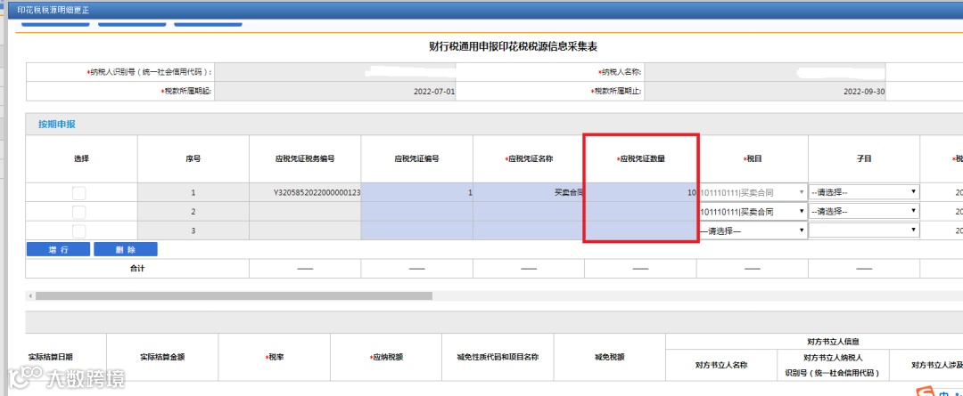 【应税凭证数量】:逐份申报应税凭证时填1,合并汇总填写应税凭证时填写合并汇总应税凭证的数量。合并汇总填写应税凭证时,只能合并适用同一税目且内容高度相似的应税凭证。如图所示。