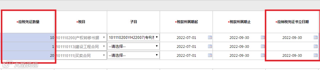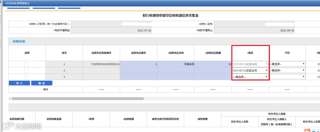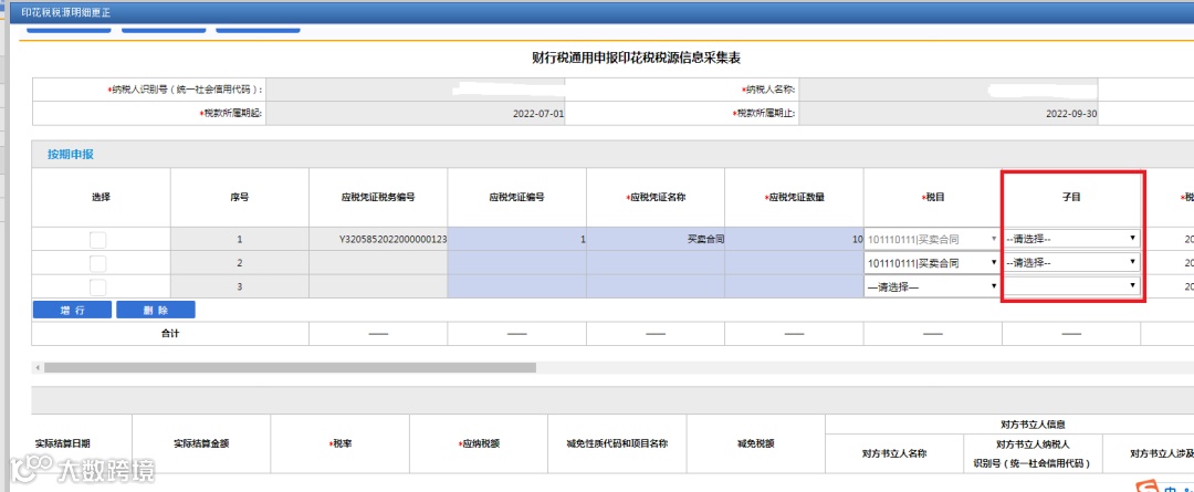 【子目】:填写对应税目的征收子目。这里需要注意的是,产权转移书据税目对应的子目必填,其他应税合同税目对应子目选填。其中融资租赁合同、买卖合同、保管合同、仓储合同、财产保险合同、营业账簿不需要填写子目。如图所示。