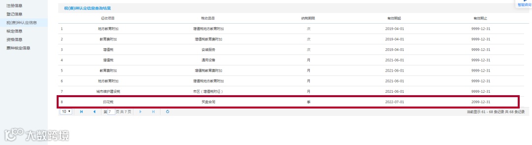 按期申报印花税的纳税人,已完成印花税税种信息认定,如下图中的印花税买卖合同税收品目。点击【我的信息】-【纳税人信息】-【税(费)种认定信息】可查询税种认定信息。若不存在按期申报的税种认定,则需要先到税务机关办理相应的税种信息认定,按次申报时,无需认定印花税税种信息。