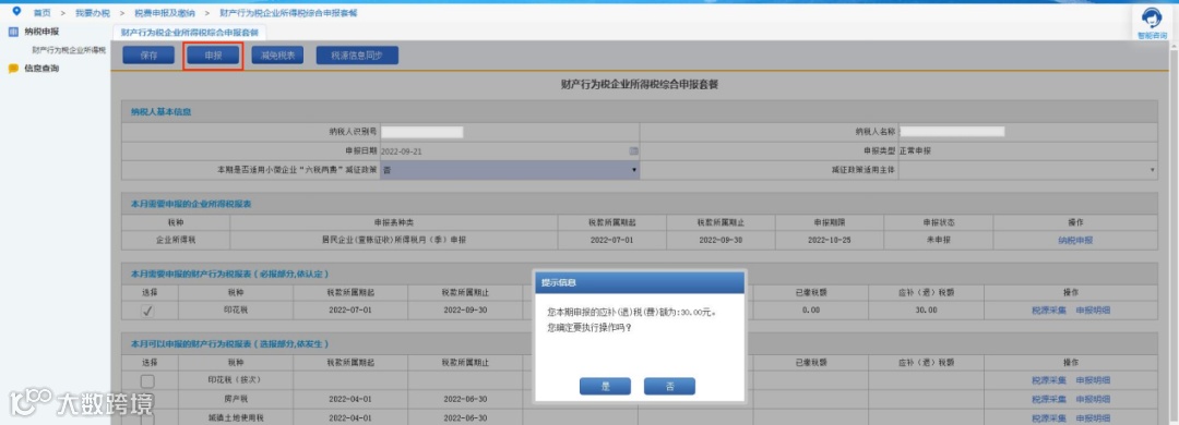 确认税额信息无误后,点击“申报”,系统会提示您本次需要缴纳的金额,确认无误后点击“是”,申报信息提交至税务端。