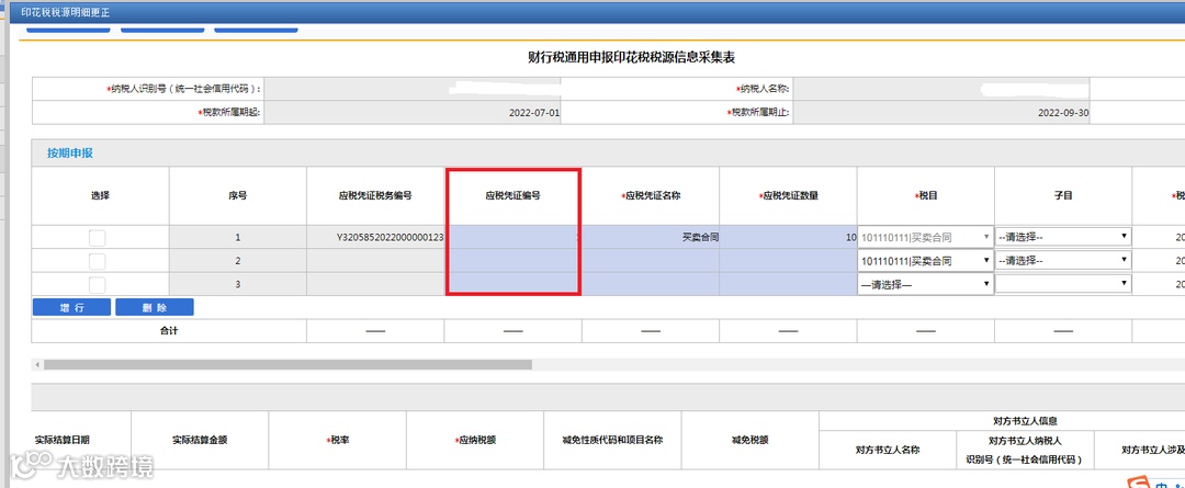 【应税凭证编号】:填写纳税人书立的应税合同、产权转移书据或者营业账簿的编号,无编号可不填写。如图所示。