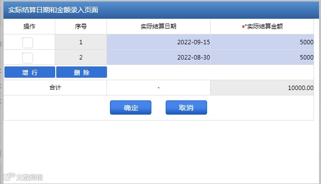 点击【实际结算日期】或【实际结算金额】,系统弹出表格填写实际结算日期和实际结算金额2列,若未确定计税金额的应税合同、产权转移书据多次结算的,可以增行、删行,对填写内容进行保存和取消。如图所示。
