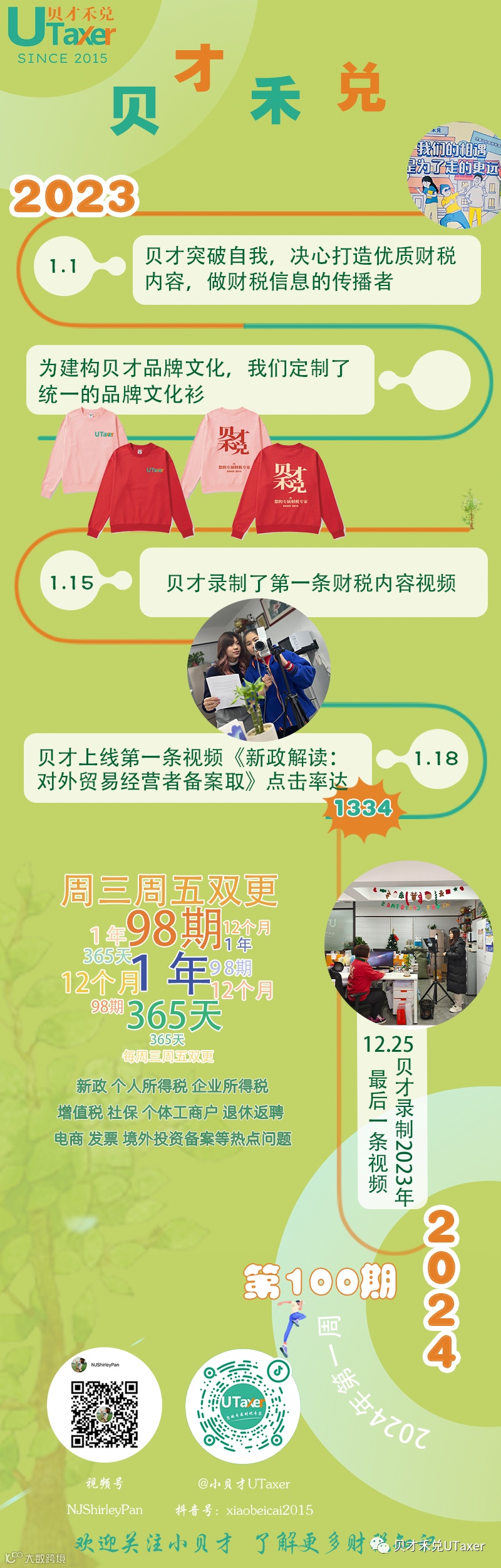 1月18日,小贝才上线了第一条财税视频《新政解读:对外贸易经营者备案取》,截至2023年末,小贝才发布了100条财税短视频。