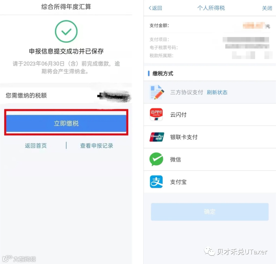 如果汇算结果为补税,您可以点击【立即缴税】,通过三方协议支付、云闪付、银联卡支付、微信、支付宝等方式完成缴税。