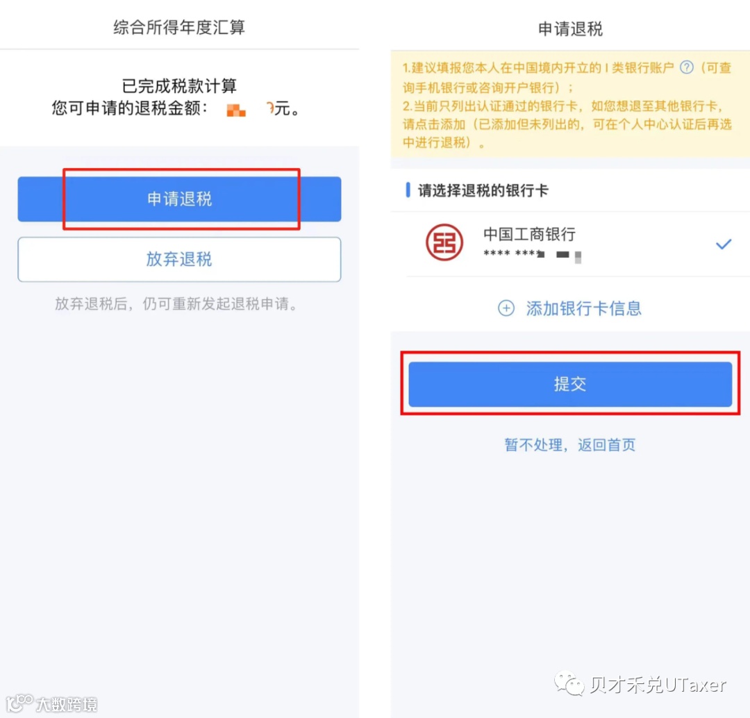 如果汇算结果为退税,您可以点击【申请退税】,选择已绑定的银行卡或添加银行卡信息,点击【提交】,待审核通过后,退税款将直接退到您的银行账户,请耐心等待。