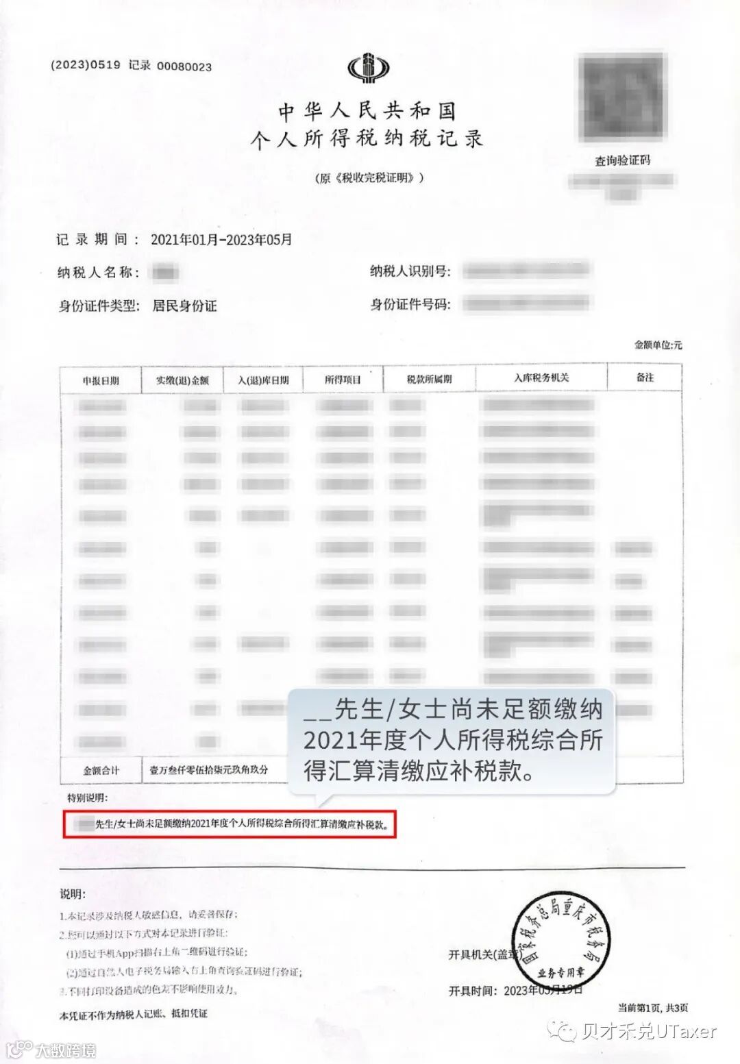 个人所得税《纳税记录》示例