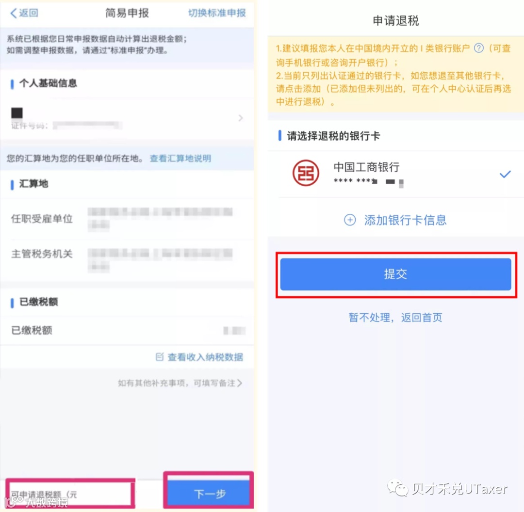 进入简易申报页面后,您可以根据系统提示,核对个人基础信息、汇算地、已缴税额和可申请退税额,然后点击【下一步】,选择已绑定的银行卡或添加银行卡信息,快速申请退税。