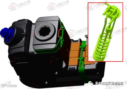 1.将尿素箱从托架上拆下,拆下红圈处螺栓及管路等即可取下尿素箱。