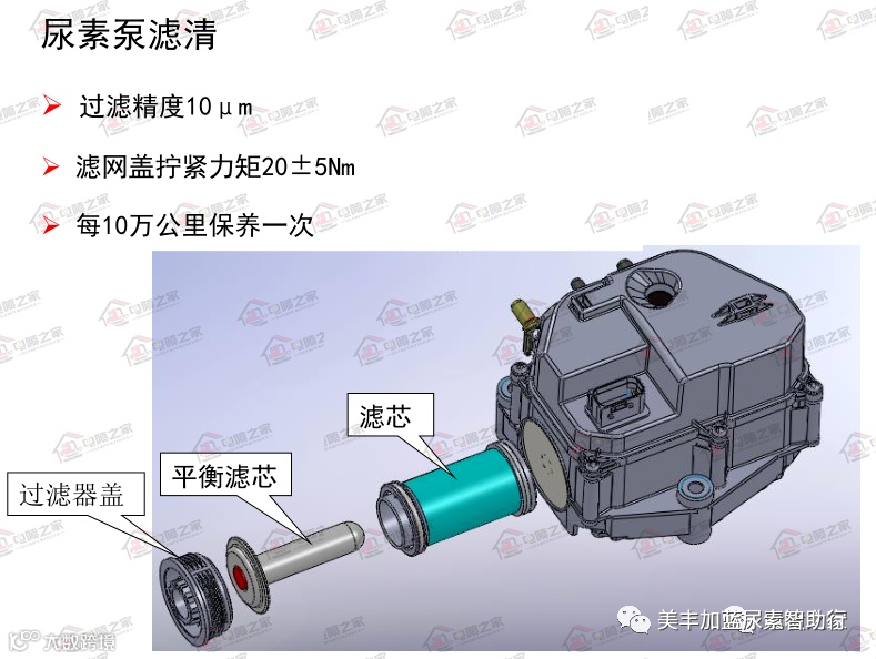 所有的尿素泵都有过滤器或滤芯,技术要求必须定期清理或更换,否则时间久了会导致堵塞或破损以致失去过滤作用,必然引起系统工作失调。
