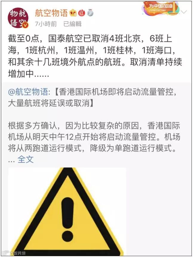 另据知名航空博主、微博航空时评团成员@航空物语消息,截至截至5日0点,国泰航空已取消4班北京,6班上海,1班杭州,1班温州,1班桂林,1班海口,和其余十几班境外航点的航班。