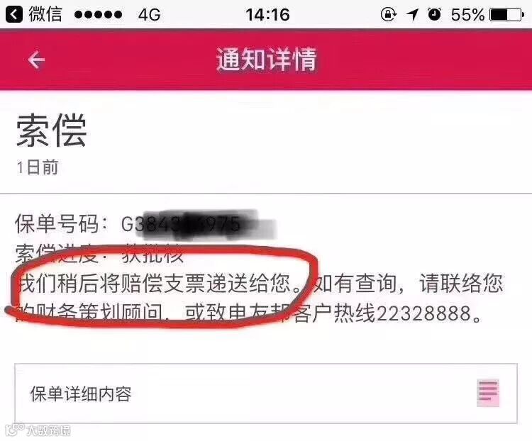 下面我们来看一下理赔进度的通知详情: