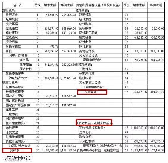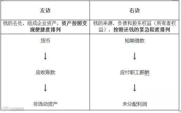 资产负责表其实很容易看懂,表的左(上)边是钱的去处,右(下)边是钱的来源。