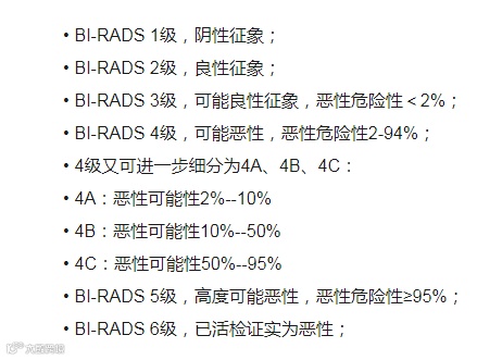 乳腺疾病一般有乳腺增生、乳腺纤维瘤、乳腺结节、乳腺炎、乳腺癌等。最常见的评估乳腺病灶恶性程度与风险的主要方法是BI-RADS分级评估系统,将乳腺疾病分为1-6级,级别越高,恶性可能性越大。
