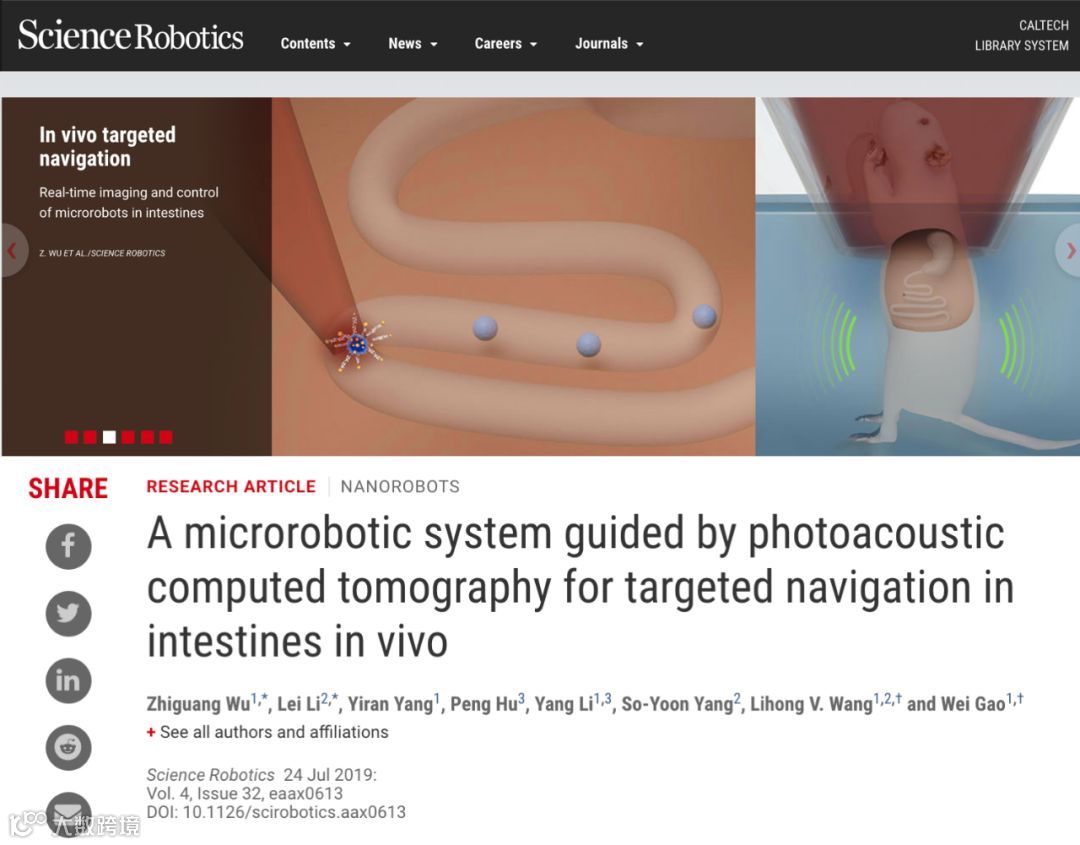 刚刚美国科学家又宣布一项重大科技突破:借助光声断层成像技术,实时控制纳米机器人,让它们准确抵达人体某个部位(比如肠癌病人的肠道肿瘤处),进而让纳米机器人实现药物递送,或进行智能微手术。