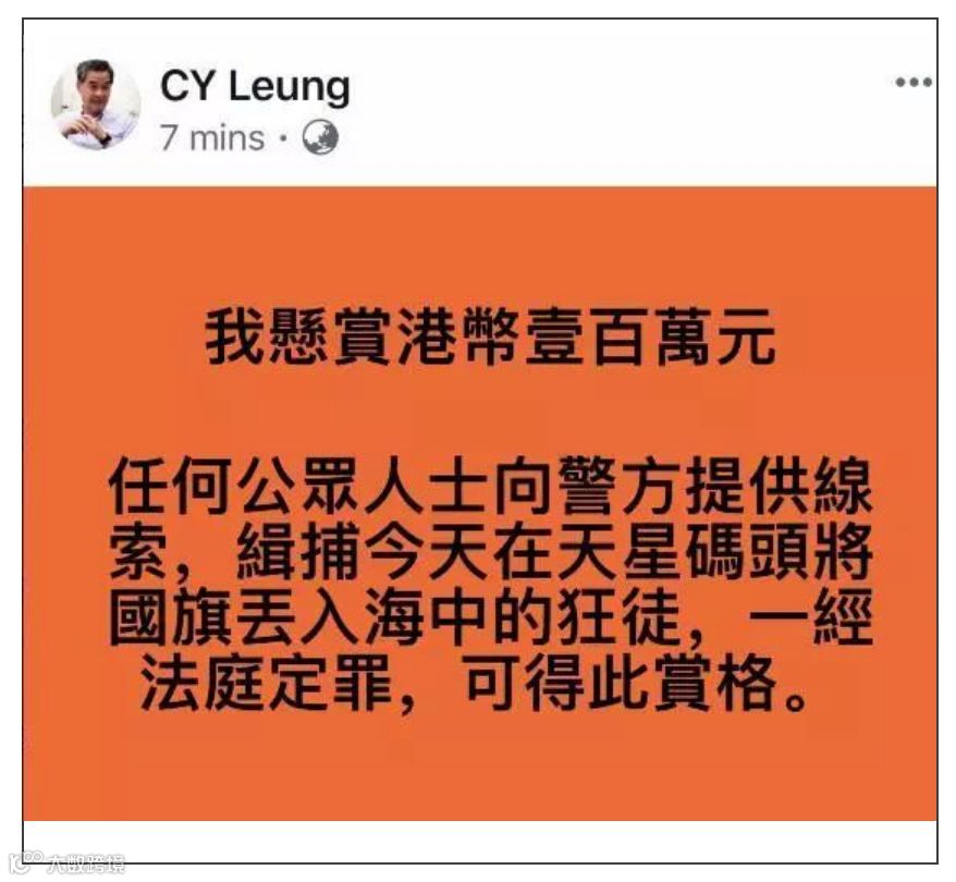 香港前特首梁振英甚至悬赏100万,誓必要抓住侮辱国旗的人。