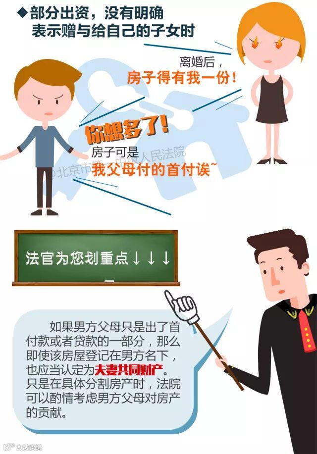《婚姻法司法解释(三)》第七条规定:婚后由一方父母出资为子女购买的不动产,产权登记在出资人子女名下的,可按照婚姻法第十八条第(三)项的规定,视为只对自己子女一方的赠与,该不动产应认定为夫妻一方的个人财产。