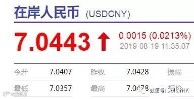 周三,人民币兑美元汇率为1美元兑7.04元人民币,自2月以来已贬值约5.3%。下图为2019年8月19日11:35在岸人民币报价。