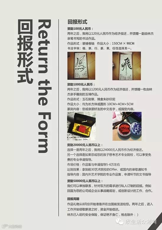 他列出了一系列自己的偿还方案:对较低资助的,除偿还资助费用外,还列出赠送自己的书法作品、自己雕刻的玉璋作品等;对资助20000元以上的,一是可以选择两年后偿还24000元,二是可以选择对其孩子上艺术院校进行专业申请指导;而资助5万元以上的则可以针对其需求进行私人定制的回报,例如回国为其公司工作,或创新设计方面的合作。