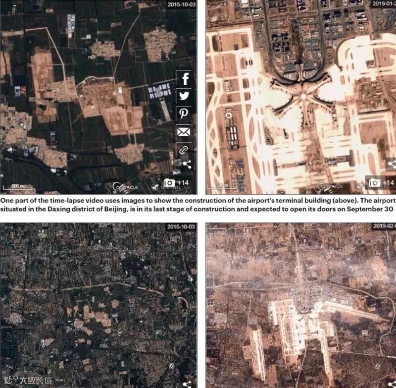 由数百张卫星图像制作成的延时视频显示,中国新建的北京大兴国际机场已近成型。图片来源:《每日邮报》网站