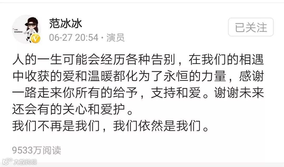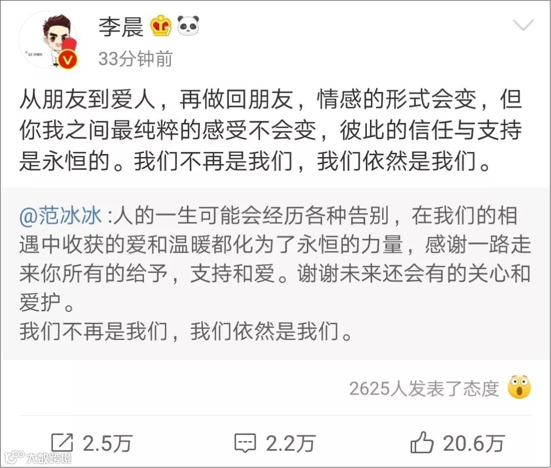 范冰冰发布一条微博,称“一生中可能会经历各种告别”,众人纷纷揣测背后的深意,就在众人一头雾水的时候,李晨转发微博,称两人“从朋友到爱人,再做回朋友”,证实两人已经分手。