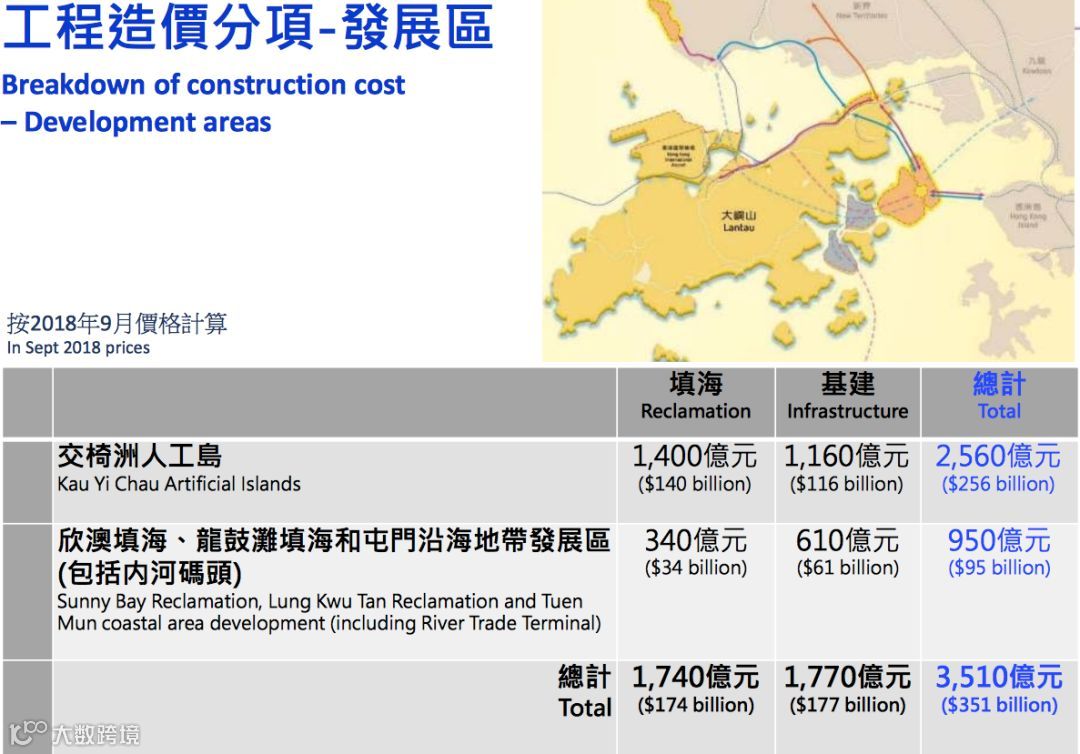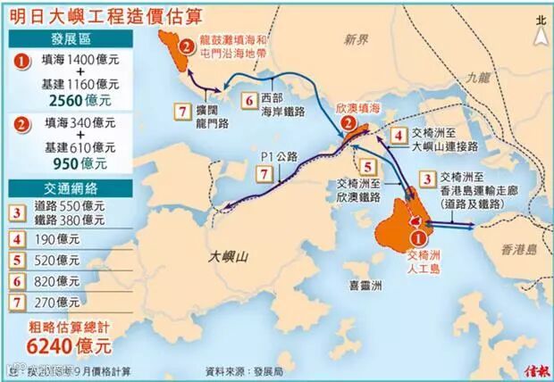 香港发展局局长黄伟纶召开记者会公布工程造价粗略估算:以去年9月的价格计算,预料交椅洲首阶段1000公顷人工岛的填海工程将涉及1400亿港元,另外1160亿港元为该区的基本道路、水务及排污等基建开支;欣澳、龙鼓滩及包括内河码头在内的屯门沿海发展,另外需要340亿港元及610亿港元作为填海及基建成本。上述发展区的成本共计3510亿港元,再加上多条道路及铁路的成本,整个“明日大屿”计划的成本至少6240亿港元。