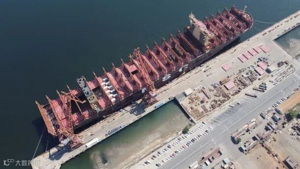 )船舶制造有限公司厂区一艘已经下水准备交付的船舶(无人机照片)。记者 赵子硕 摄