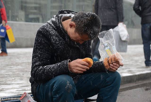 一个农民工兄弟,在西安火车站门口,在大雪纷飞中,嚼着面包,等着干活。