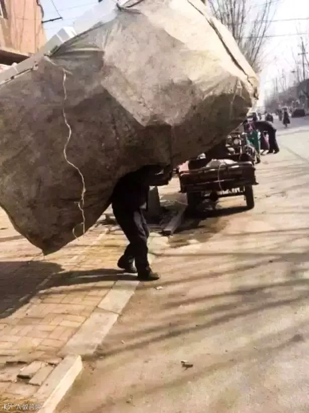 一个六七十岁的老人,背着几十斤的箱子,一步一步艰难前行。