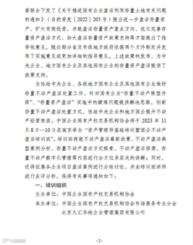 导读:关于举办资产管理师基础培训暨国企不动产盘活培训班的通知