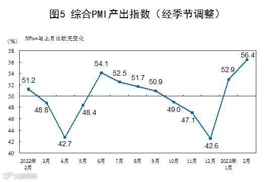 2月份,综合PMI产出指数为56.4%,比上月上升3.5个百分点,高于临界点,表明我国企业生产经营景气水平继续回升。