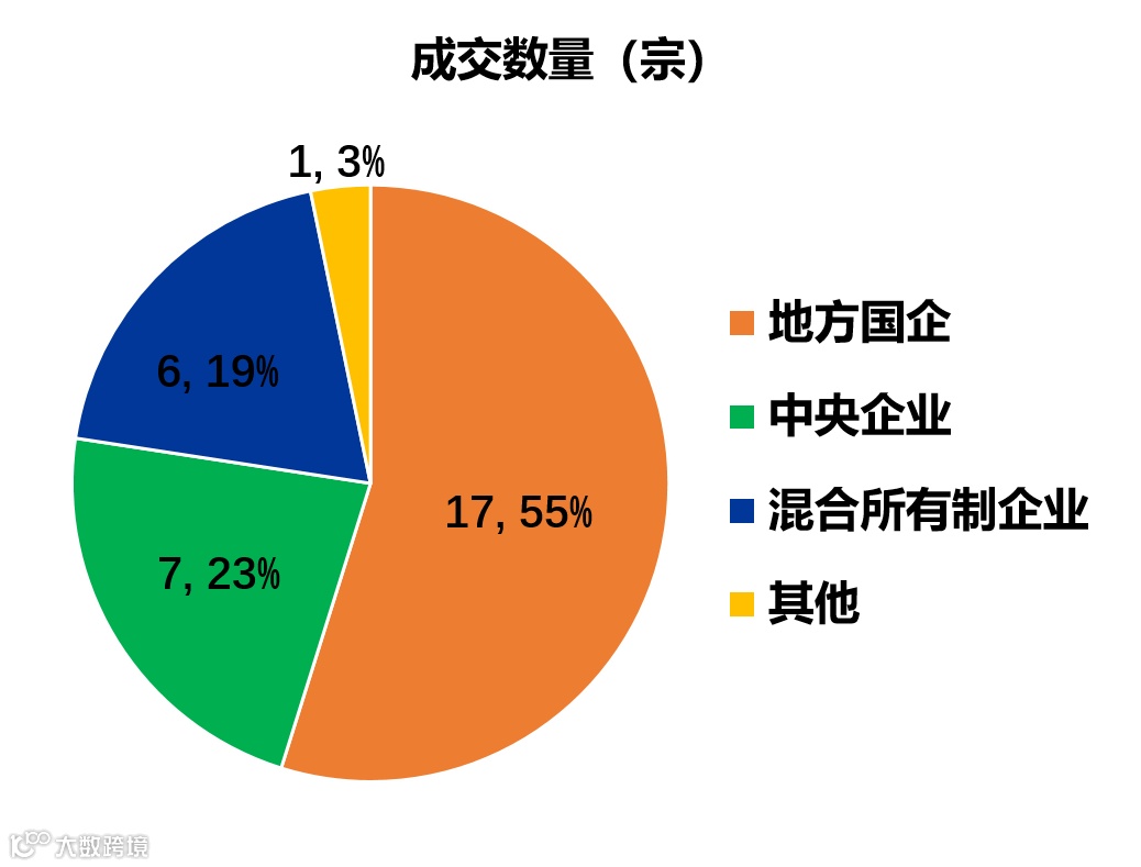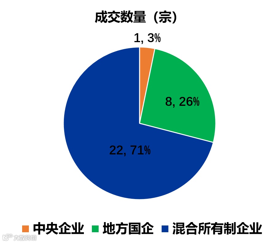 上述31宗并购项目中,企业性质涉及中央企业、地方国企、混合所有制企业,其成交数量和金额分别如下两图: