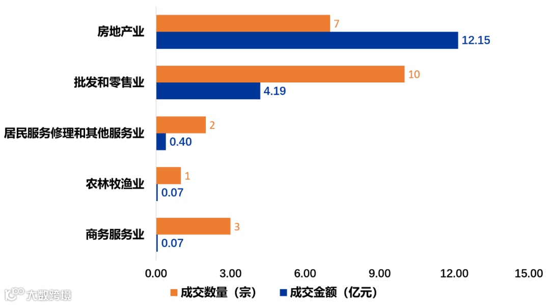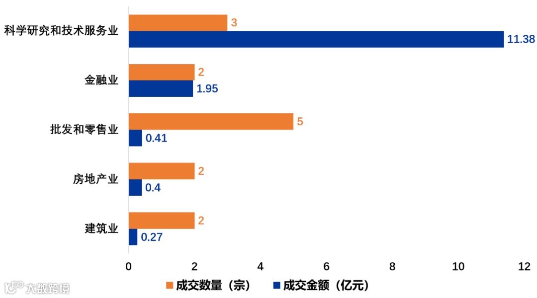 31宗并购项目中,标的企业涵盖11个行业,成交金额最大的五个行业的成交数量和金额分别如下图: