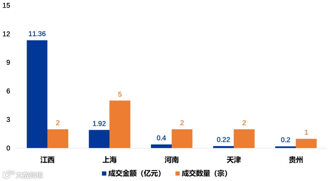 31宗并购项目中,标的企业所属16个地区,成交金额最大的五个地区的成交数量和金额分别如下图:
