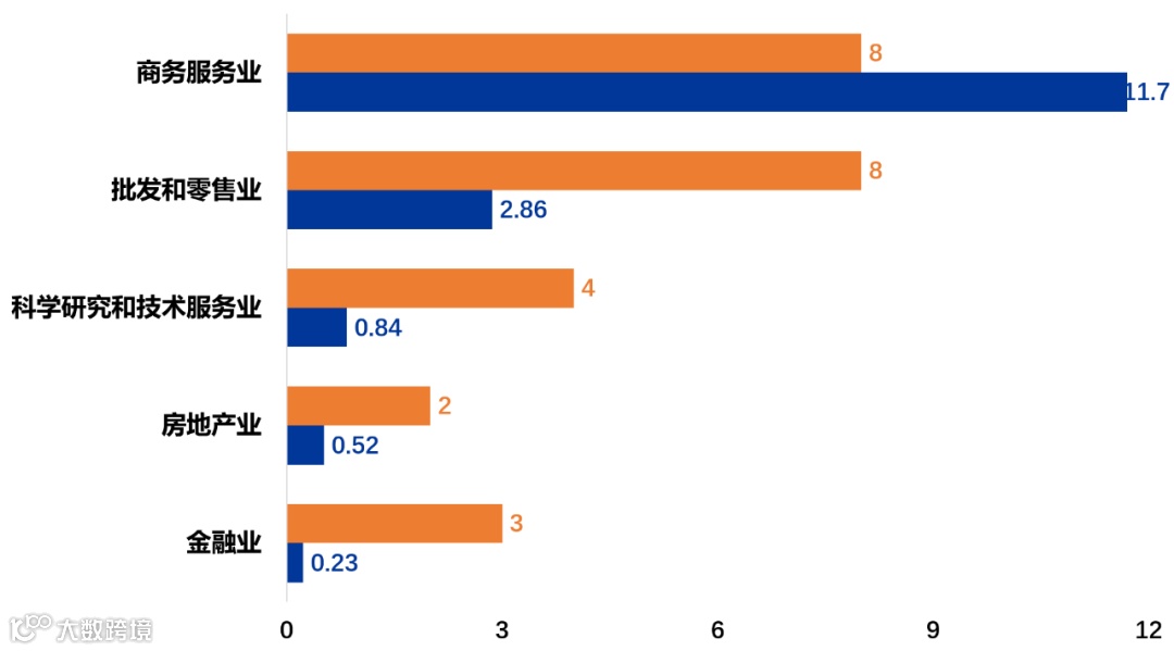 30家企业受让方涵盖多个行业,成交金额最多的五个行业的成交数量和金额分别如下图: