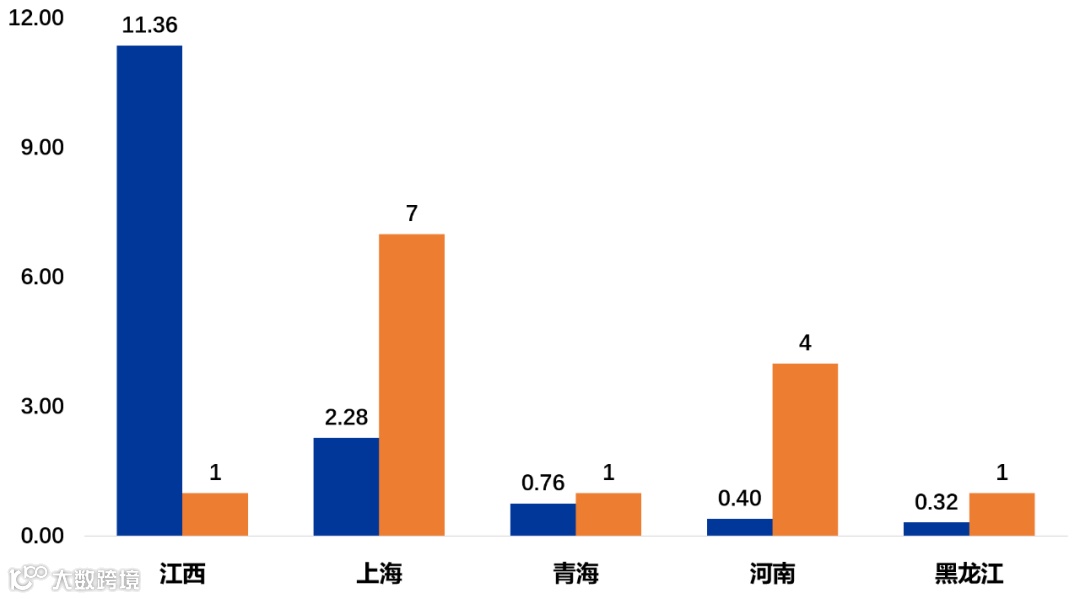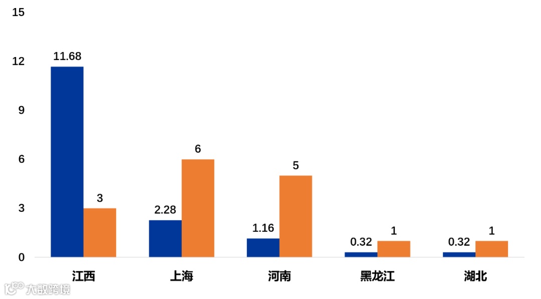 30家企业受让方所属多个地区,成交金额最大的五个地区的成交数量和金额分别如下图: