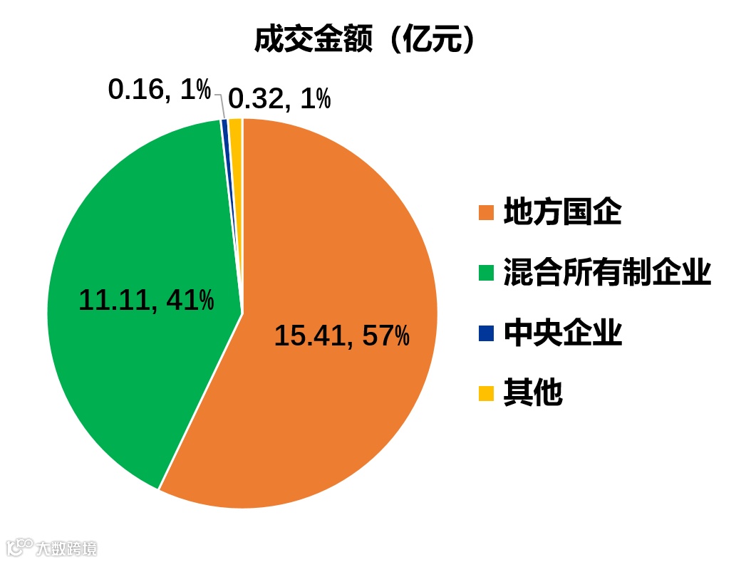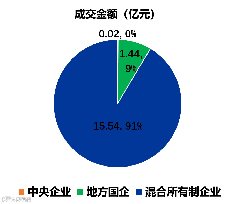 30家转让方企业性质涉及中央企业、地方国企、混合所有制企业,其成交数量和金额分别如下两图: