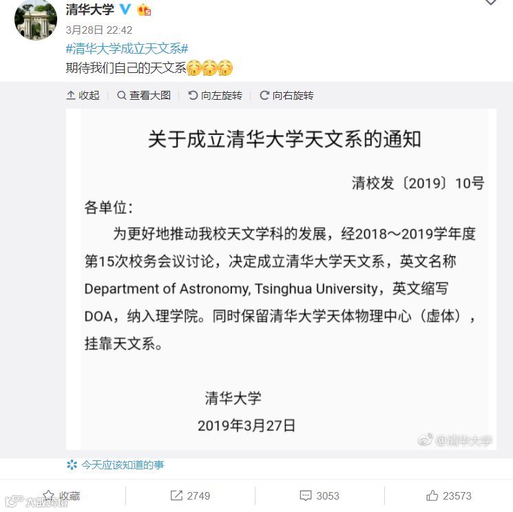 根据其微博中的图片显示,清华大学在3月27日发布了关于成立清华大学天文系的通知: