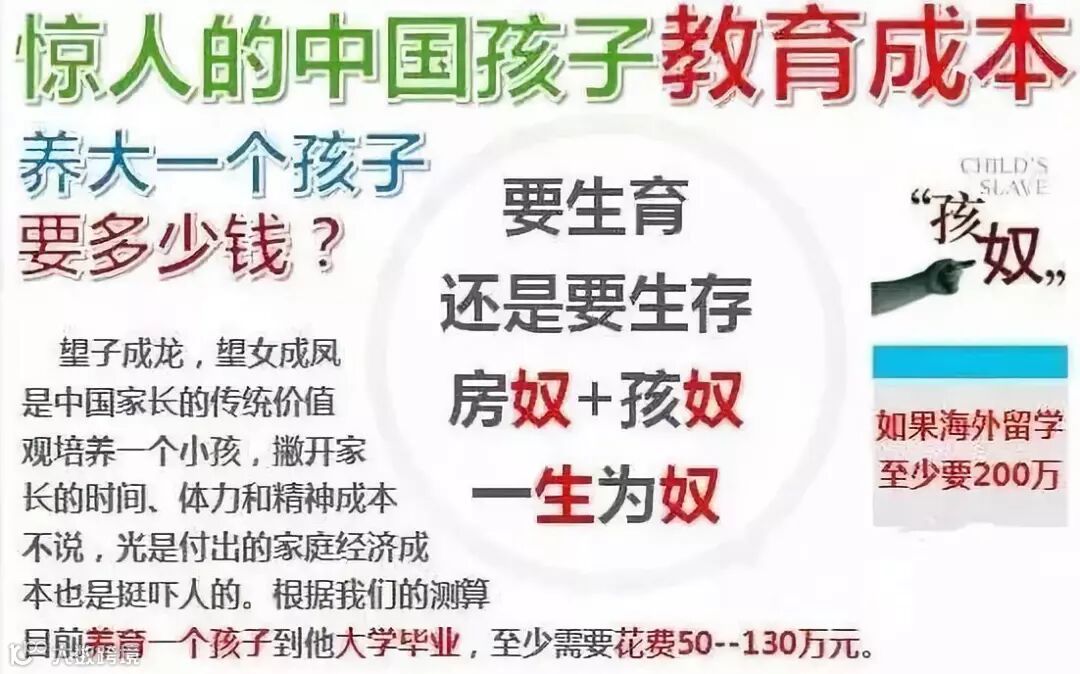 根據中國社科院的一項研究成果,中國父母把孩子帶大到16歲的撫養總成本平均已達25萬元,平均每年的花費就是1.6萬。而養育一個孩子到他大學畢業,則至少需要花費50萬-130萬元,如果海外留學則達到200萬。