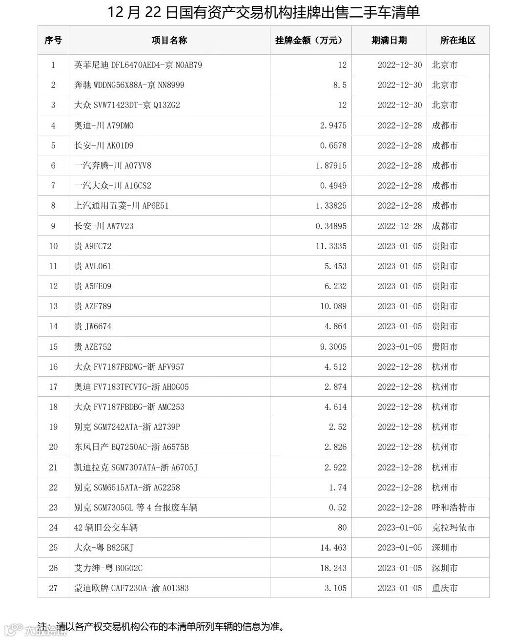 奔驰、奥迪、别克等——国有资产交易机构挂牌出售二手车信息(12月22日) 产投数智