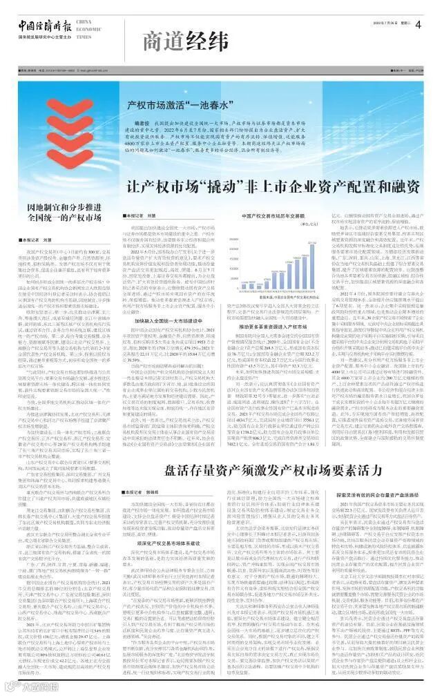 2021年,北京产权交易所助力中国五矿集团转让其所持有的五矿营口中板有限责任公司54%的股权,成交价格138亿元,增值金额29.47亿元。上海联合产权交易所与上海土地中心探索产权市场与土地市场联动交易模式,公开转让上海弘安里企业发展有限公司80%股权及转让方对标的公司40.61亿元债权,实现竞价成交42.2亿元。各地正在为全面融入全国统一大市场、建成规范而高效的产权交易市场而努力。