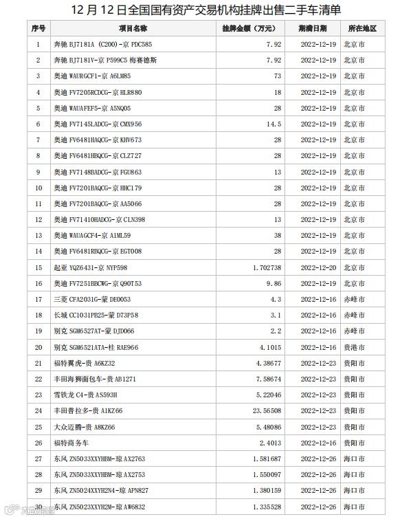 这里有500元一辆的二手奥迪——国有资产交易机构挂牌出售二手车信息(12月12日) 产投数智