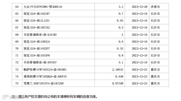 数量:今日全国国有资产交易机构公开挂牌出售的二手车项目总计75个