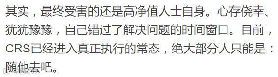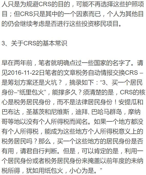 如果你认为目前只向金融机构提供一个某地的纳税记录和税单,就万事大吉了,请明白这是违背CRS基本常识的。如果你说,现在金融机构对此是okay的,我赞同这是一个实践的阶段性问题;但一个违背CRS常识的做法是不牢靠的,出问题是常态、不出问题是走运。同时可参照上述CRS常识一。