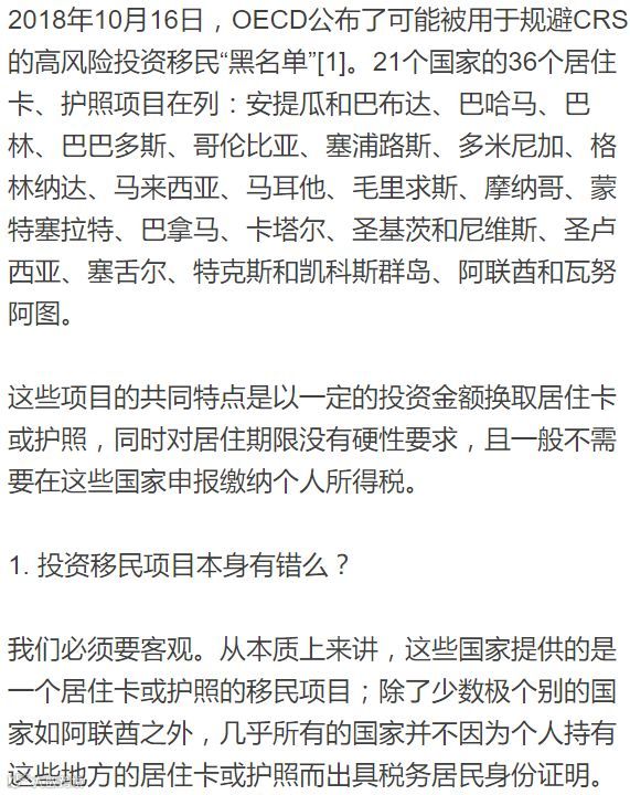 随着CRS的执行,毫无疑问的是,金融机构的尽职调查是越来越严的。比如,OECD推出规避CRS之投资移民“黑名单”的落脚点重点在金融机构这里: