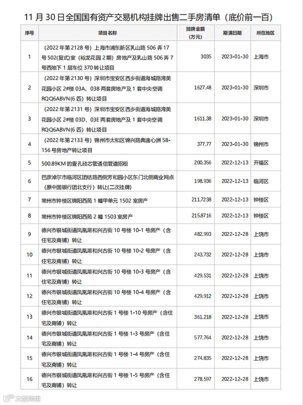 导读:11月30日全国国有资产交易机构挂牌出售二手房信息