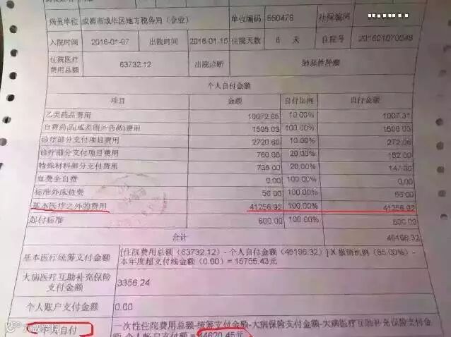客户是一名公务员,肺癌。1月7号入院,1月15号出院,短短8天时间,总费用63732元;结果社保基本医疗只报了15755元(看似65%的报销比例很高,但扣去自费部分,能报的总额太少),社保补充医疗报了3356元,自费44620元。后续的费用呢?社保能解决多大问题?值得深思!!!